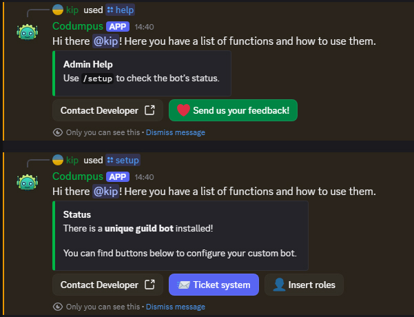 /helpa guide for users and for admins seperately and unique for each guild./setupfor admins only, so they can check the status of the bot and setup their unique features.- Custom ticket system.
